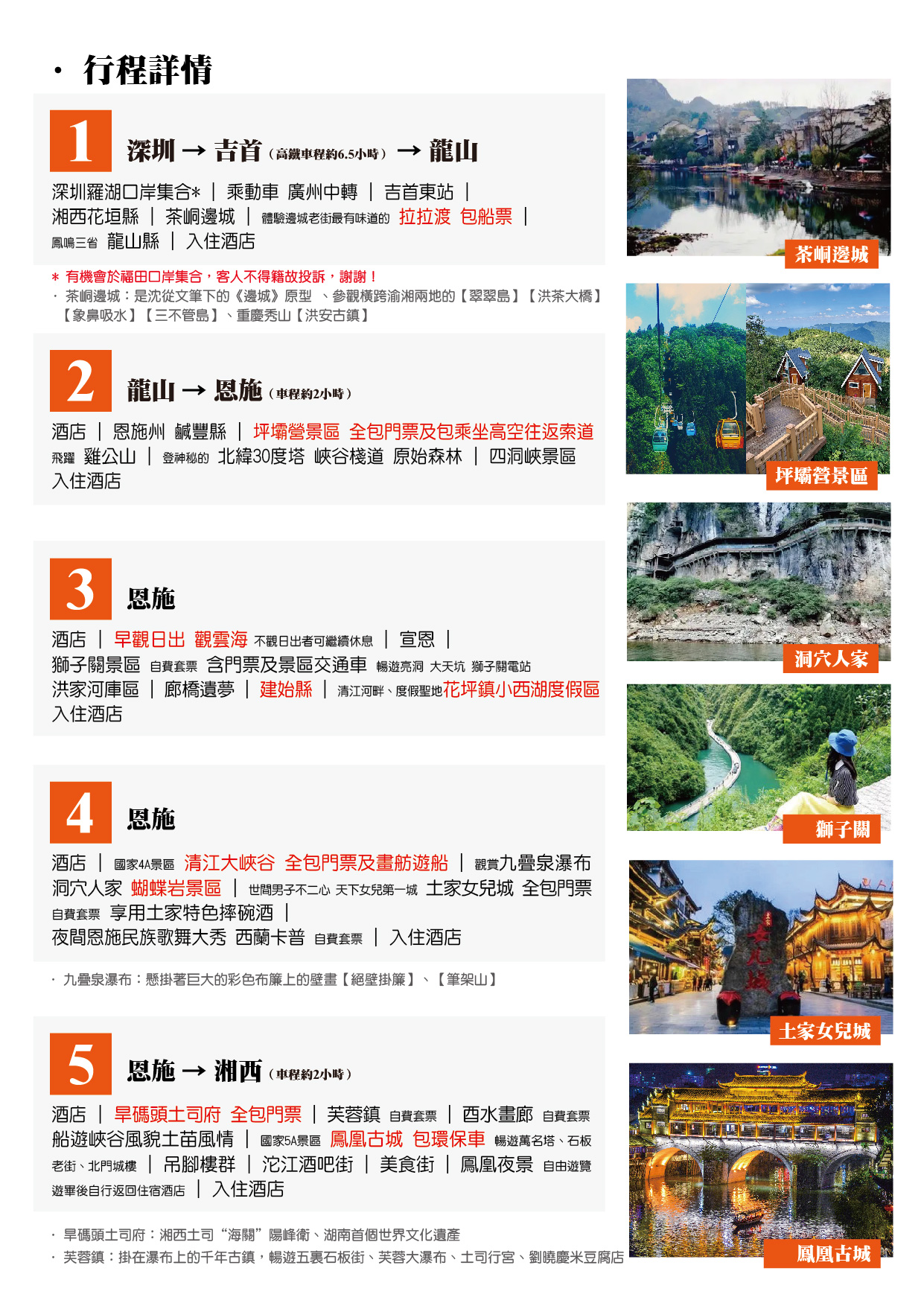 品嘗:【武陵山土雞風味】【建始土菜風味味】【土家特色摔碗酒】【清江河鮮風味】 住宿:提升全3晚、5星標準酒店 暢遊:湘西州花垣縣一腳踏三省"【茶峒邊城】鹹豐縣康養勝地【坪壩營景區】(全包門票及包乘坐高空往返索道)中國天然氧吧【建始縣】清江河畔、【花坪鎮小西湖度假區】國家4A景區【清江大峽穀】【蝴蝶岩景區】湘西土司“海關”陽峰衛【旱碼頭土司府】千年古鎮【芙蓉鎮】 5A景區【鳳凰古城】