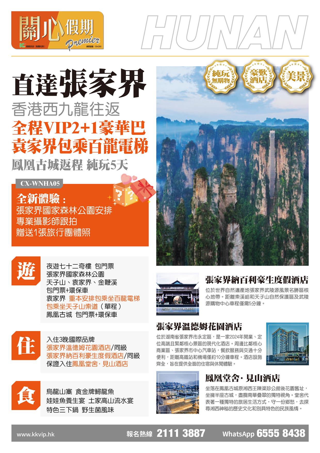 純玩【西九往返】張家界國家森林公園 袁家界 百龍天梯 天子山 鳳凰古城 VIP2+1豪華巴 高鐵5天