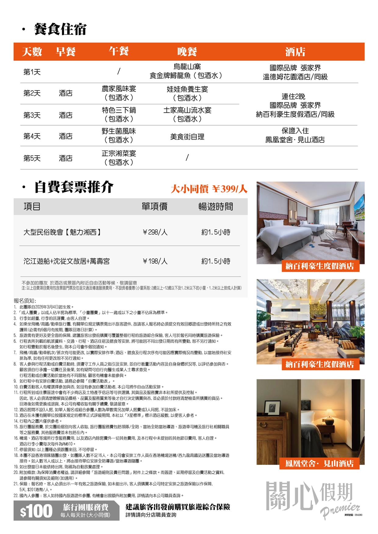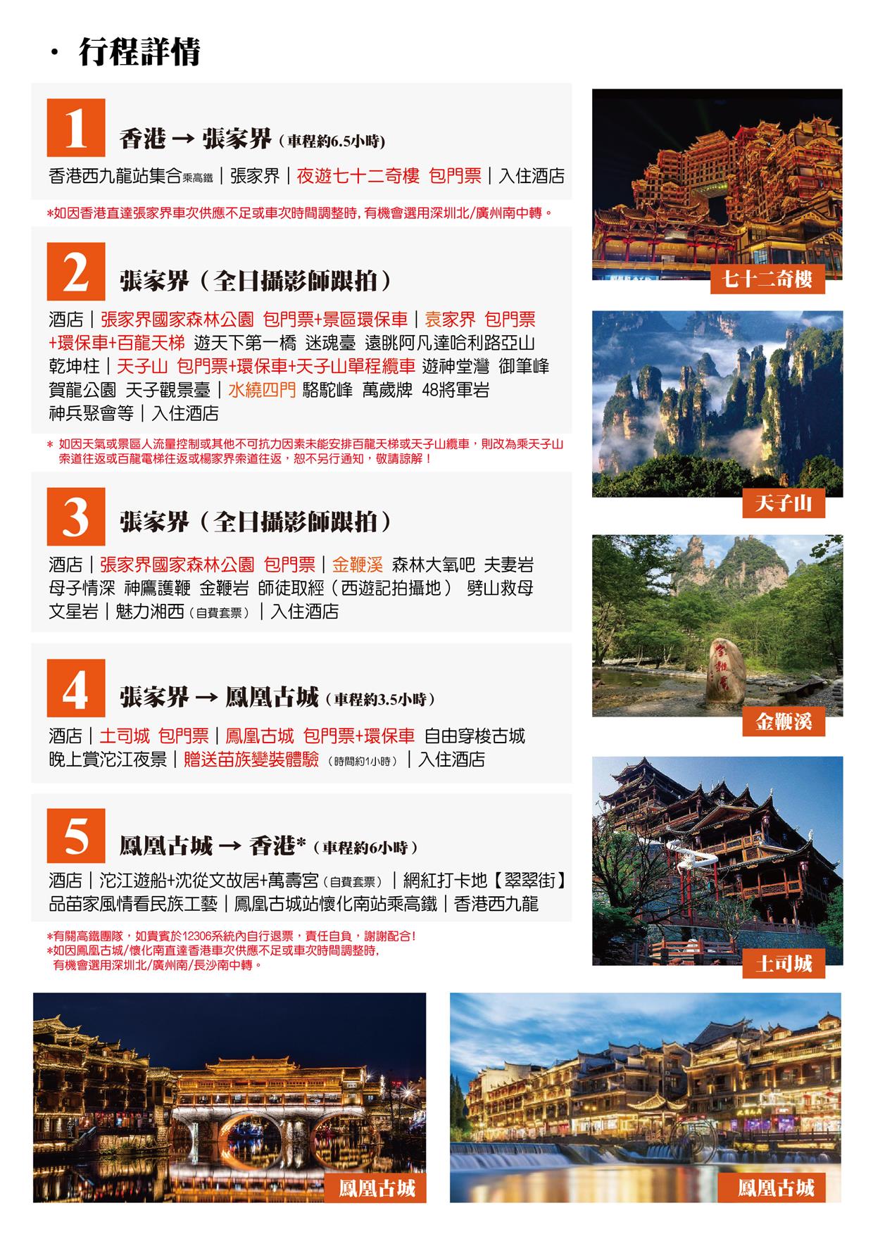 西九龍往返,去程直達張家界,鳳凰古城返程 張家界國家森林公園安排專業攝影師跟拍,贈送1張旅行團體照 住宿:入住3晚國際品牌 張家界溫德姆花園酒店/同級 張家界納百利豪生度假酒店/同級 保證入住鳳凰堂舍·見山酒店 暢遊:夜遊七十二奇樓(包門票)、張家界國家森林公園(包門票+環保車)天子山(重本安排乘坐百龍電梯)、袁家界(包乘坐天子山索道)、金鞭溪 鳳凰古城包門票+環保車