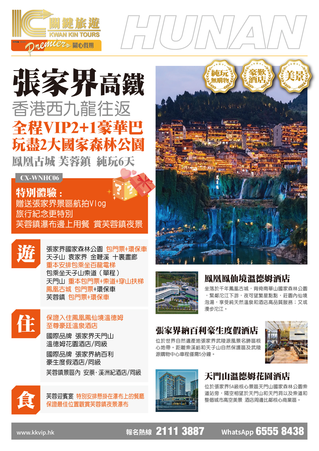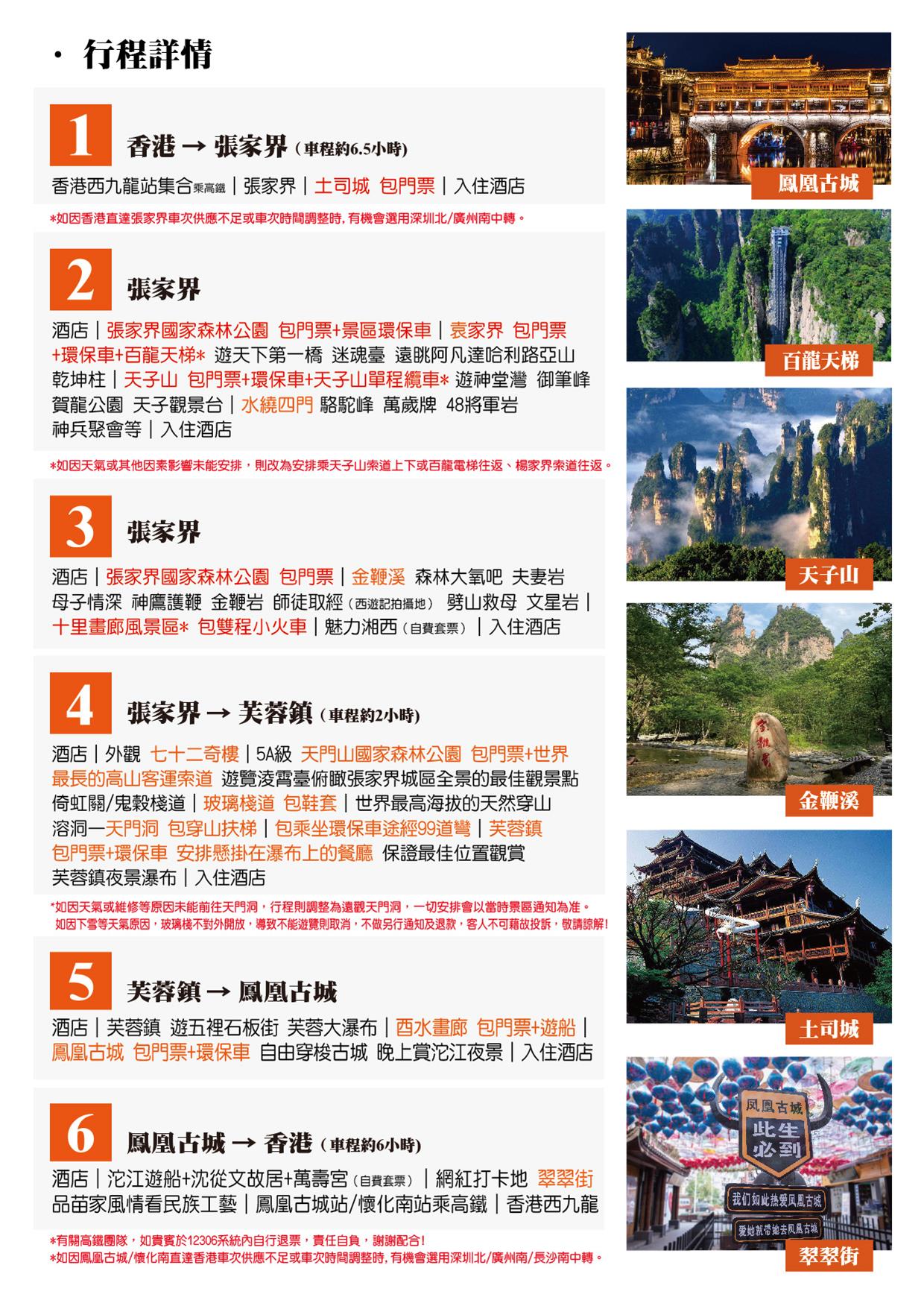 純玩【西九往返】玩盡張家界、天門山2大國家森林公園 芙蓉鎮 鳳凰古城 VIP2+1豪華巴 高鐵6天