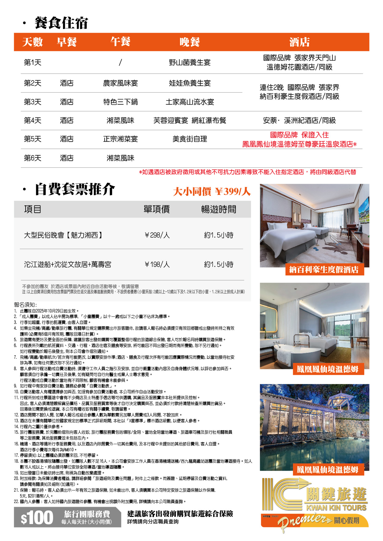 遊:張家界國家森林公園 包門票+環保車(天子山、袁家界、金鞭溪、十裹畫廊) 重本安排包乘坐百龍電梯、包乘坐天子山索道(單程) 天門山 重本包門票+索道+穿山扶梯 鳳凰古城(包門票+環保車)、芙蓉鎮(包門票+環保車) 住:國際品牌 張家界天門山溫德姆花園酒店/同級 國際品牌 張家界納百利豪生度假酒店/同級 芙蓉鎮景區內 安萘·溪洲紀酒店/同級 保證入住鳳凰鳳仙境溫德姆住至尊豪廷溫泉酒店