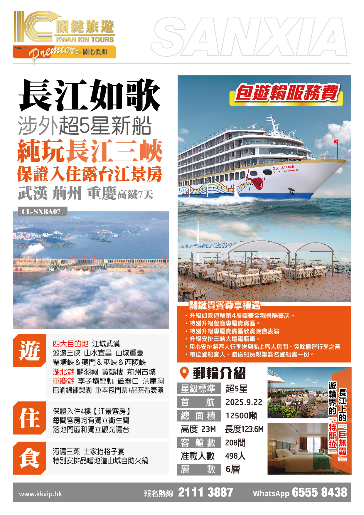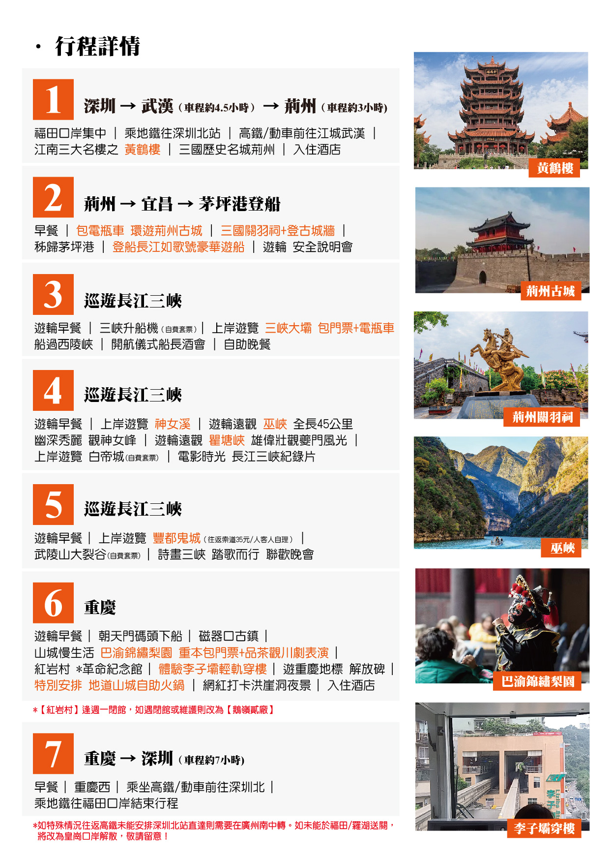 住:保證入住4樓【江景客房】每間客房均有獨立衛生間、落地門窗和獨立觀光露台; 遊:四大目的地【江城武漢、巡遊三峽、山水宜昌、山城重慶】;【瞿塘峽&夔門&巫峽&西陵峽】 湖北遊:江南名樓黃鶴樓、荊州古城、三國關羽祠;重慶遊:體驗李子壩輕軌穿樓、磁器口、洪崖洞;巴渝錦繡梨園(重本包門票+品茶觀表演) 食:沔陽三蒸、土家抬格子宴、特別安排品嚐地道山城自助火鍋