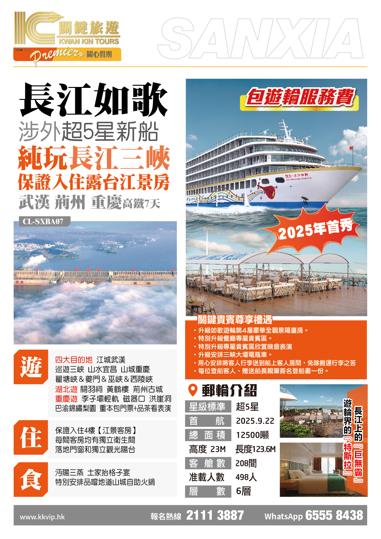 純玩無購物 長江三峽2025年首秀 涉外超5星新船【長江如歌號】武漢 荊州 重慶高鐵7天