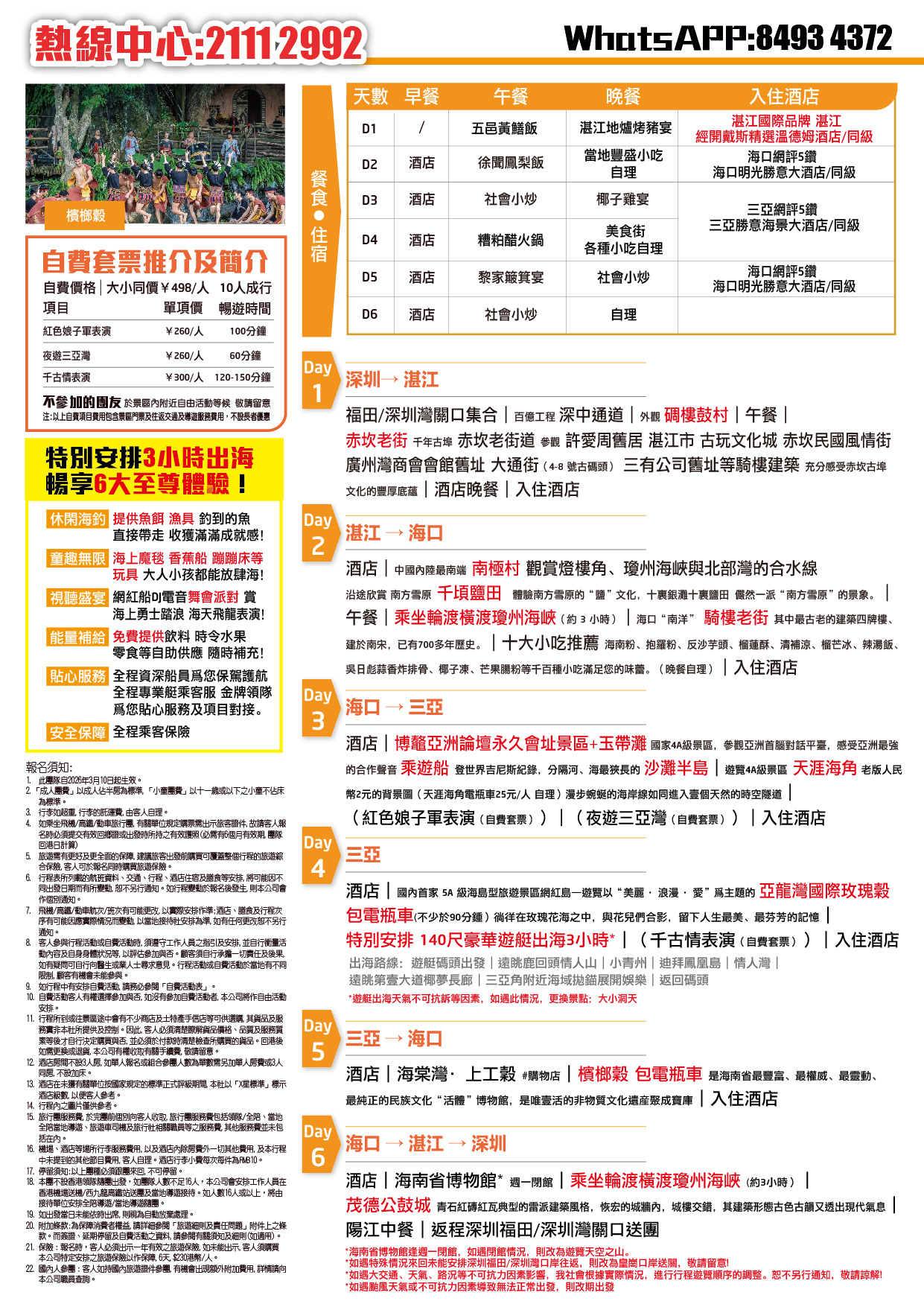 食:五邑黃鱔飯、聞鳳梨飯、海南文昌雞宴、糟粕醋火鍋、黎家簸箕宴 住:一晚鼓文化溫泉酒店(當地五星)+2晚豪華商務酒店(攜程五鑽)+2晚一線海邊酒店(攜程五鑽)+1晚國際品牌“戴斯精選溫德姆”(攜程四鑽) 遊:粵瓊二地規模最大,最完整的騎樓群,橫跨中國三大海峽之一“瓊州海峽”,體驗萬噸跨海巨輪“火車/汽車/遊客”一體滾裝船,“天涯”、“海角”、“南天一柱”,中國大陸最南端村“南極村”
