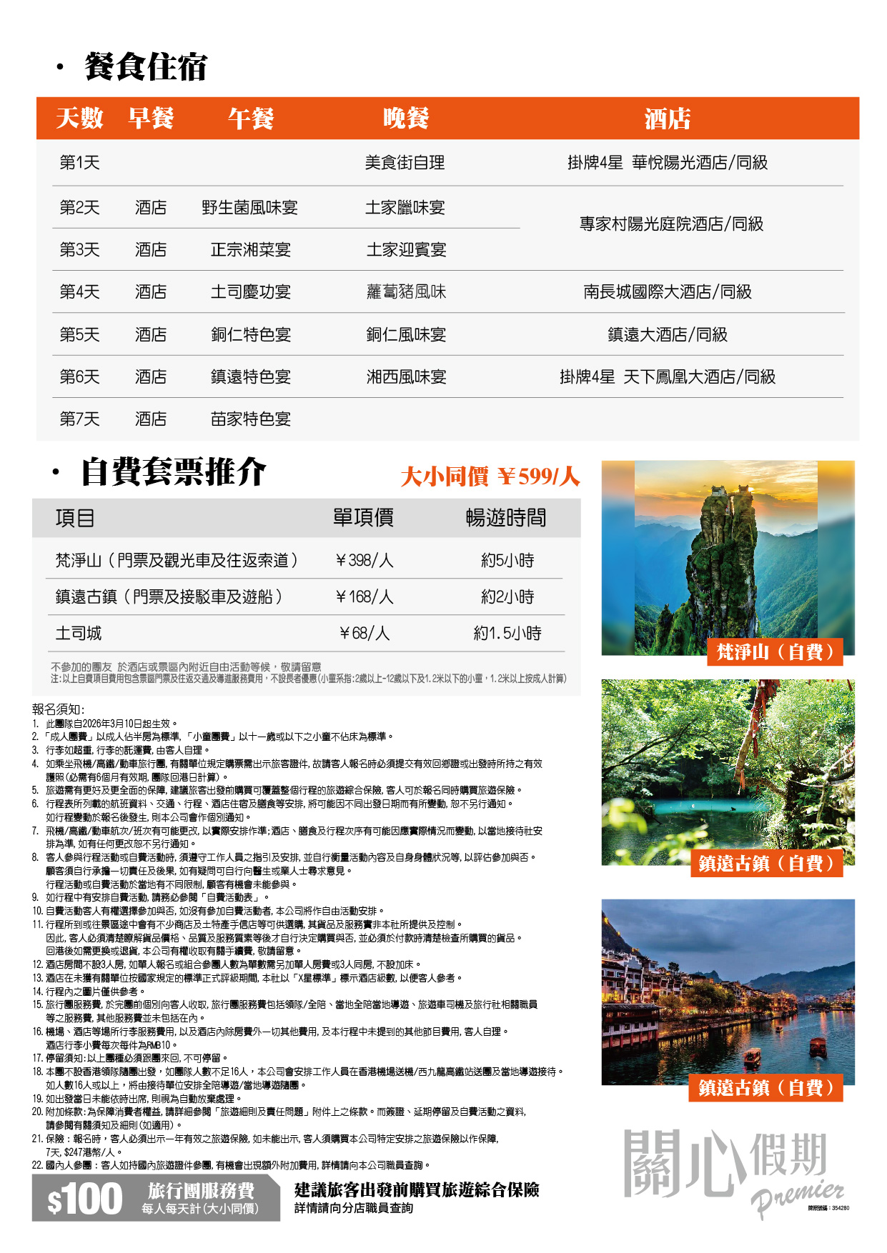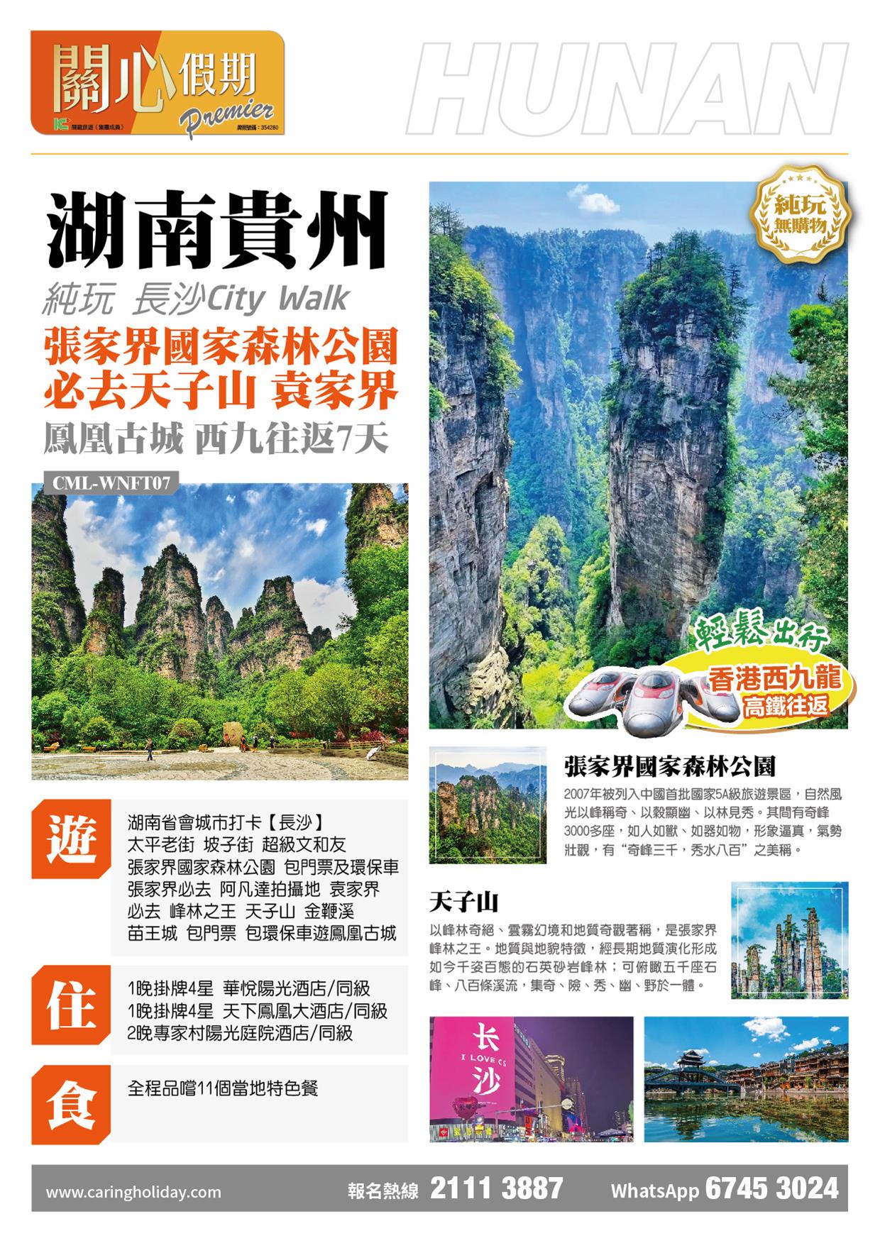 遊:湖南省會城市打卡 長沙 太平老街 坡子街 超級文和友 張家界國家森林公園 重本包門票及環保車 張家界必去 阿凡達拍攝地 袁家界 張家界必去 峰林之王 天子山 包環保車遊鳳凰古城 苗王城 包門票 住:1晚掛牌4星 華悅陽光酒店/同級 1晚掛牌4星 天下鳳凰大酒店/同級 2晚專家村陽光庭院酒店/同級 食:全程品嚐11個當地特色餐