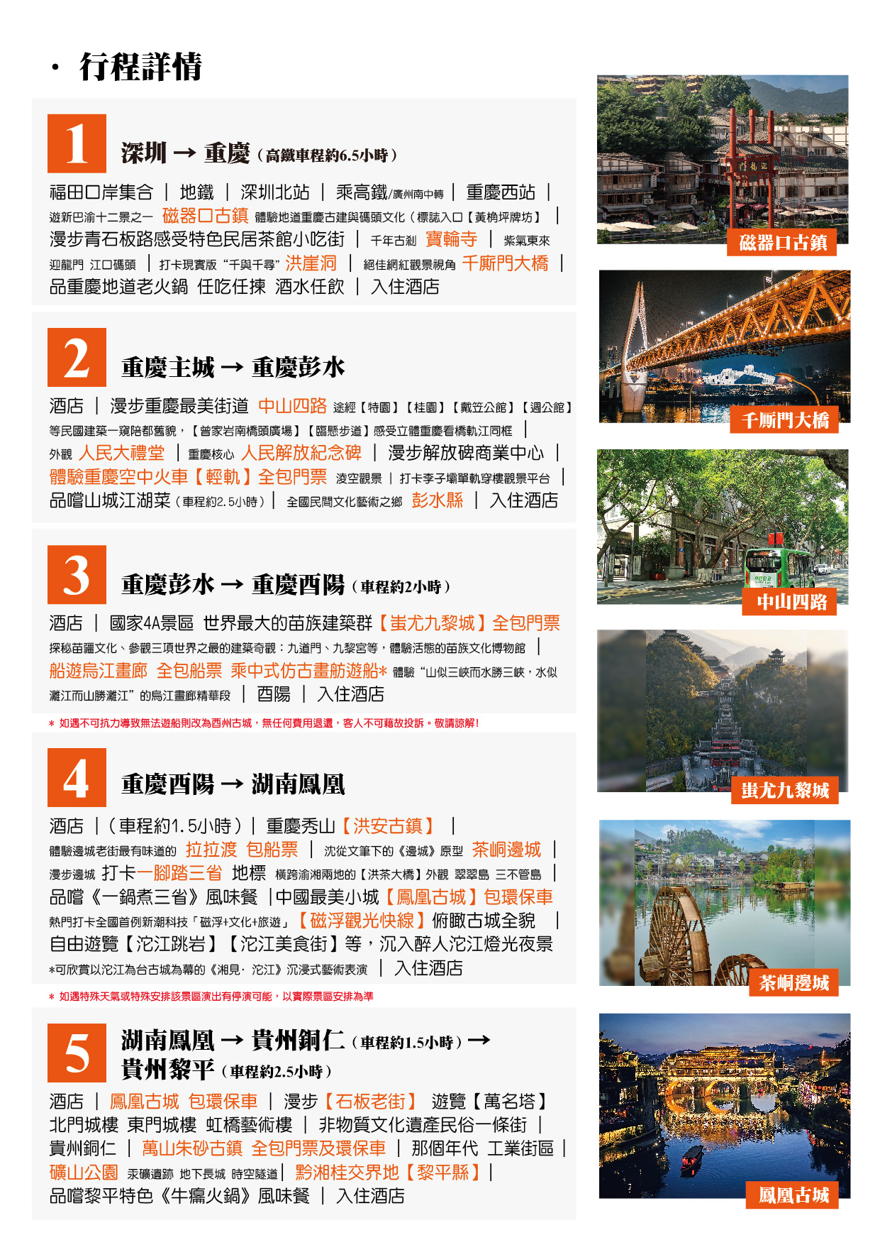 暢遊:一次暢遊4城 重慶主城:網紅必打卡磁器口古鎮 洪崖洞 千廝門大橋 李子壩輕軌穿樓 人民大禮堂中山四路解放碑 重慶彭水:烏江精華 船遊烏江畫廊、世界最大苗城 蚩尤九黎城景區 湖南:邊城茶峒 打卡磁懸浮觀光快線 鳳凰古城 貴州:萬山古鎮、隆裏古城 品嚐:重慶地道老火鍋 山城江湖菜 一鍋煮三省風味 黎平牛癟火鍋風味