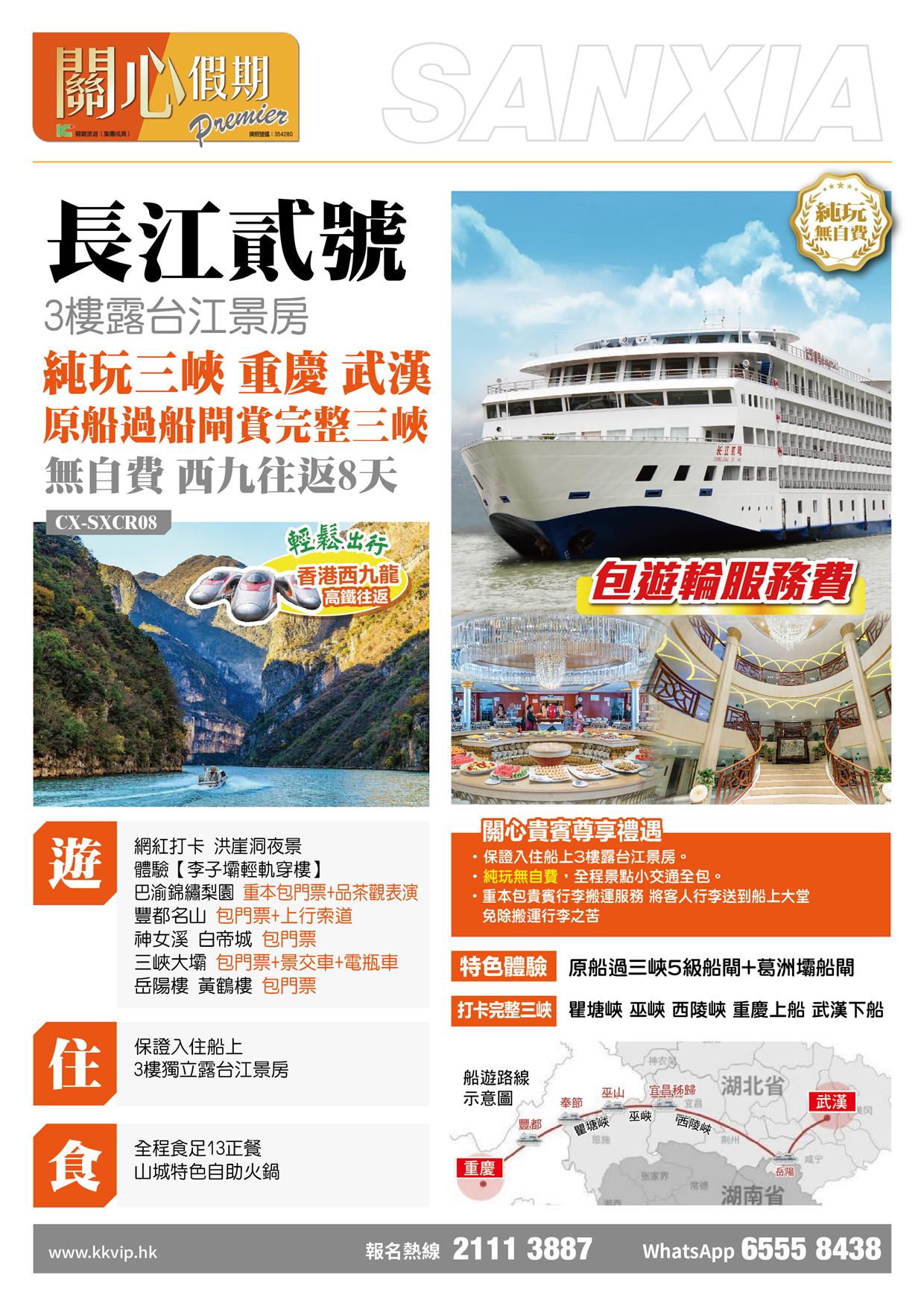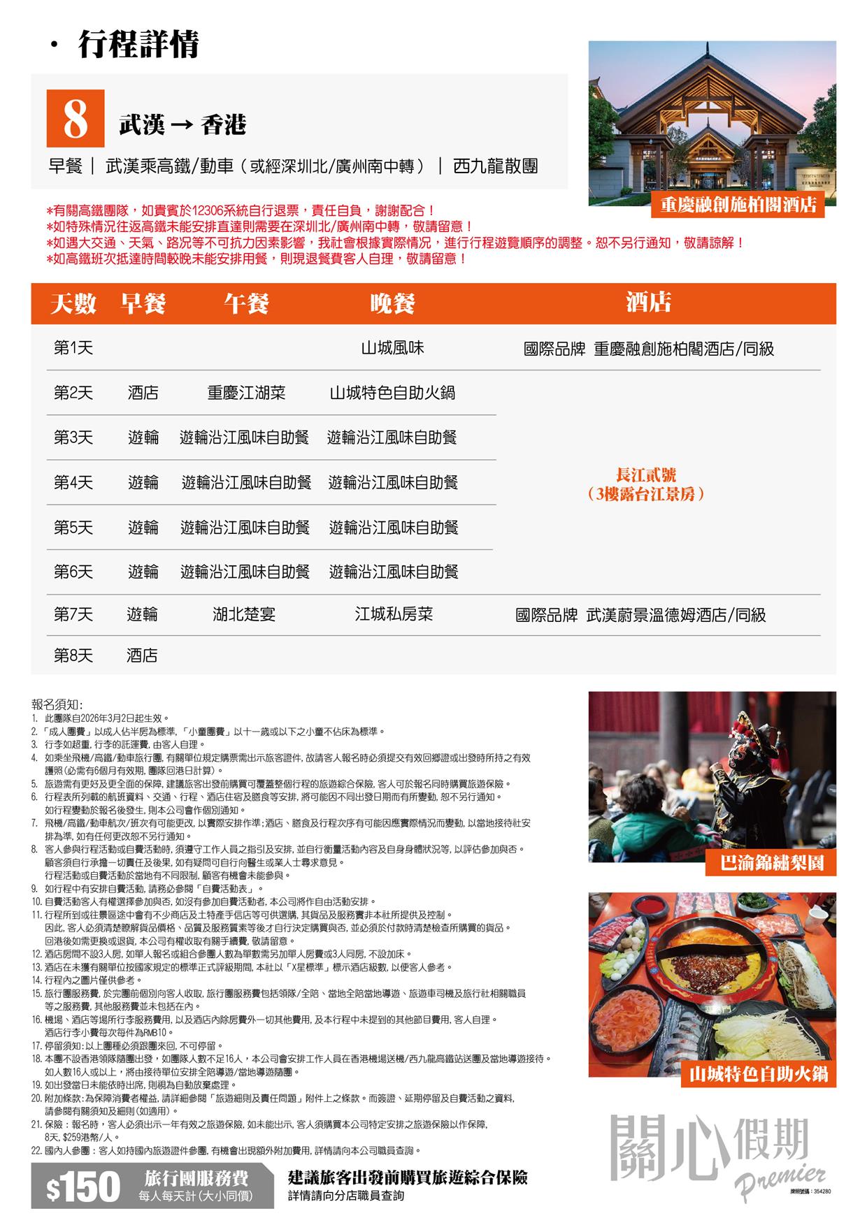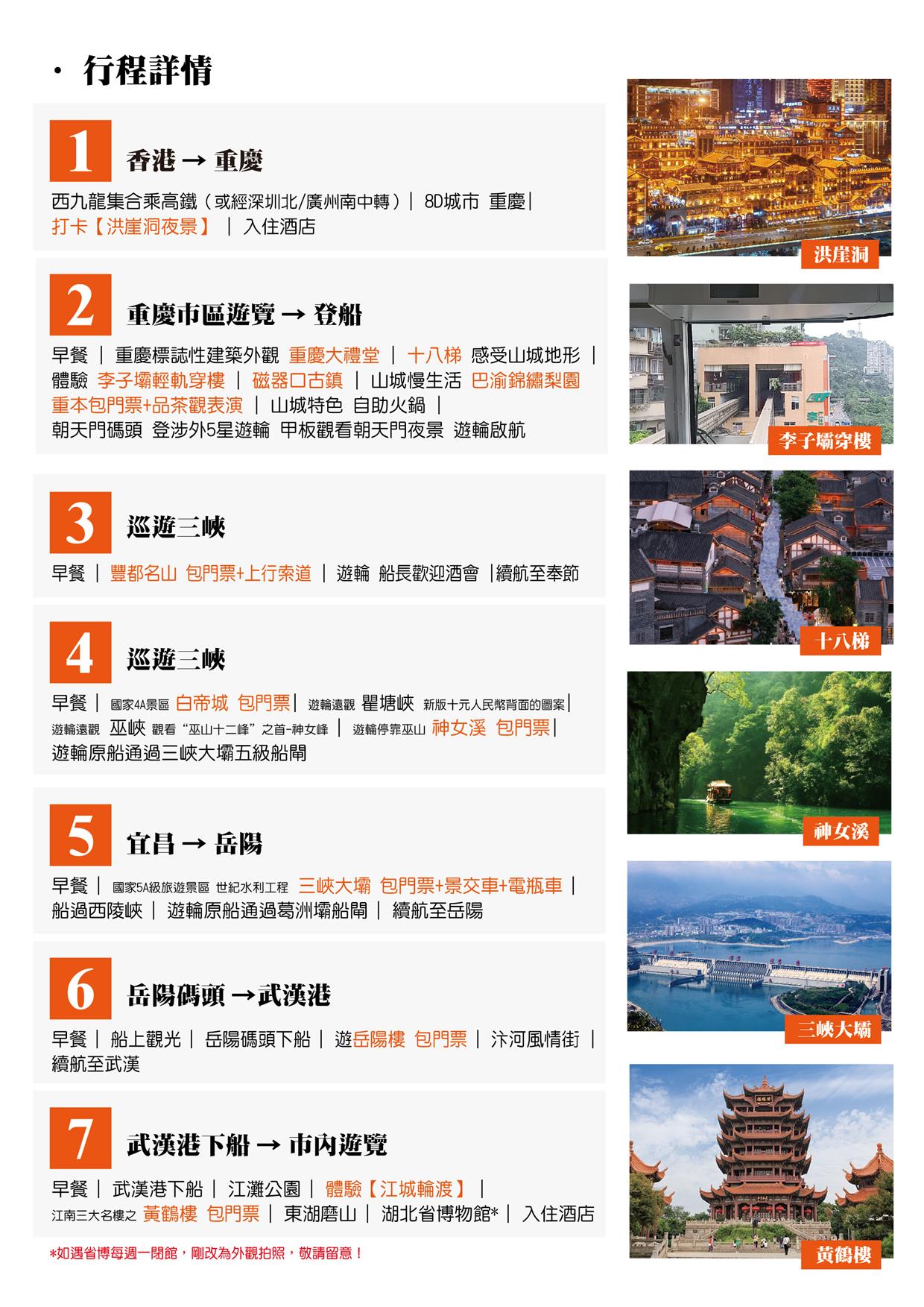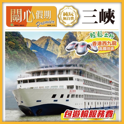包遊輪服務費 包行李搬運服務 住:保證入住船上3樓露台江景房 遊:全程景點小交通全包 打卡完整三峡 瞿塘峡 巫峽 西陵峡 原船過三峽5級船閘+葛洲壩船閘 體驗李子壩輕軌穿樓、巴渝錦繡梨園(重本包門票+品茶觀表演)、豐都名山(包門票+上行索道)、神女溪 白帝城(包門票)、三峽大壩(包門票+景交車+電瓶車)、岳陽樓 黃鶴樓(包門票)、打卡洪崖洞夜景 食:全程食足13正餐 山城特色自助火鍋