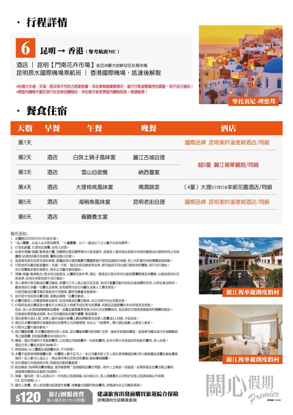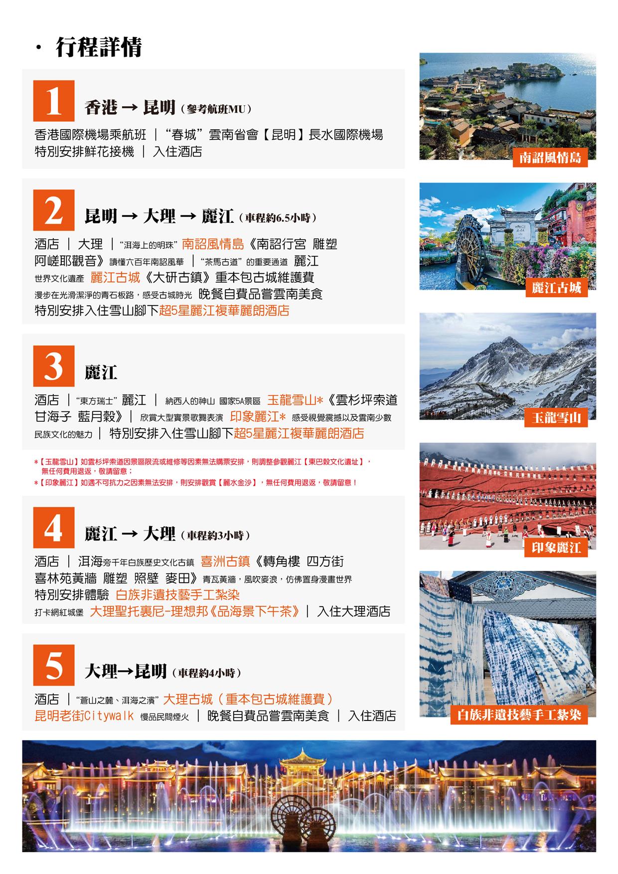品嘗:納西喜宴 藥膳養生宴 海稍魚風味宴 南涧跳菜 住宿:2晚入住雪山腳下超五星酒店【麗江複華麗朗度假酒店】 暢遊:“苍山之麓、洱海之滨”【大理古城】 茶马古道上的明珠、世界文化遗产 【麗江古城】 納西人的神山【玉龍雪山《雲杉坪索道 甘海子 藍月谷》】 洱海邊白族【喜洲古鎮】 體驗【白族非遺技藝手工紮染】 探索大理【聖托裏尼-理想邦】品海景下午茶 洱海明珠【南詔風情島】