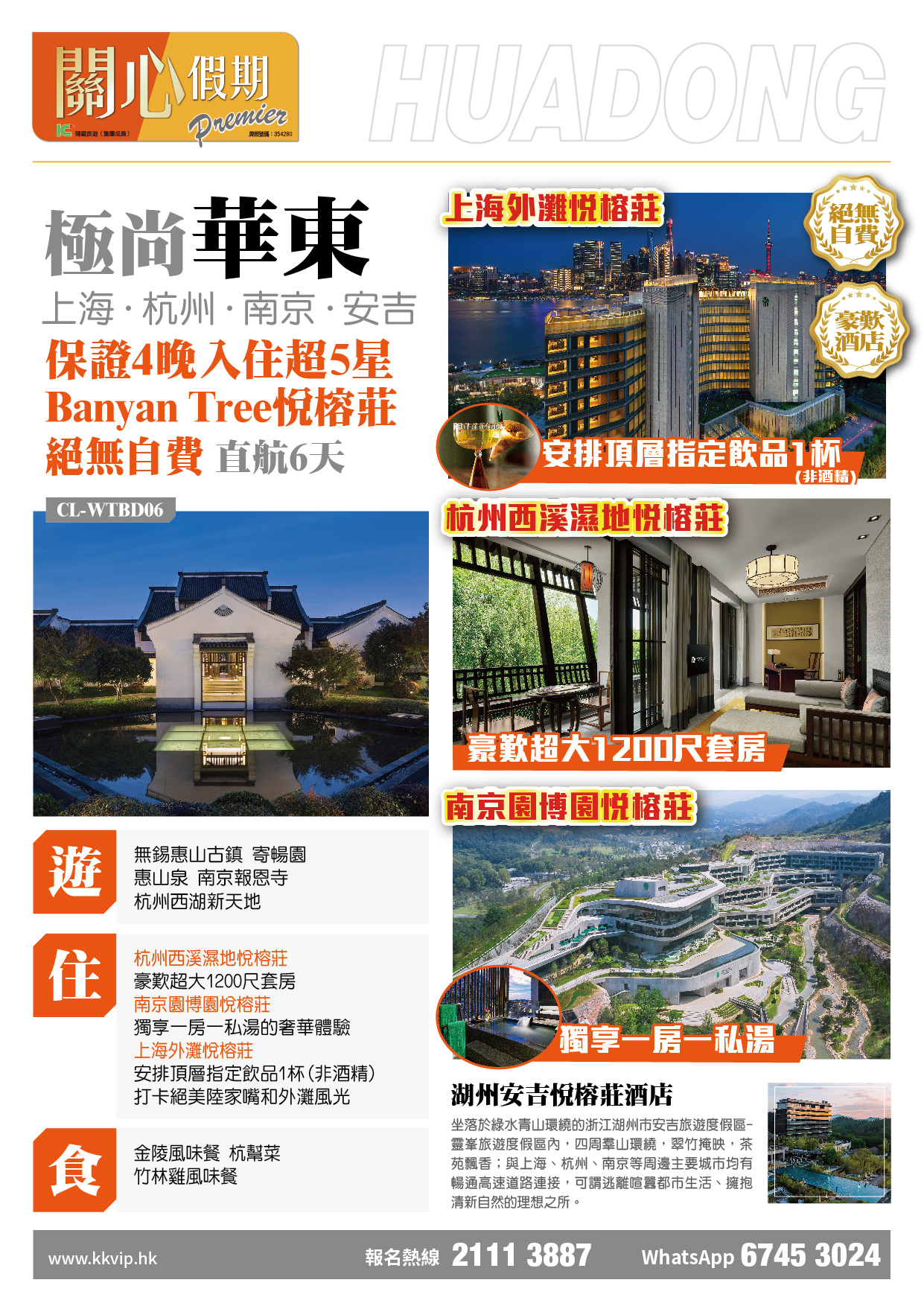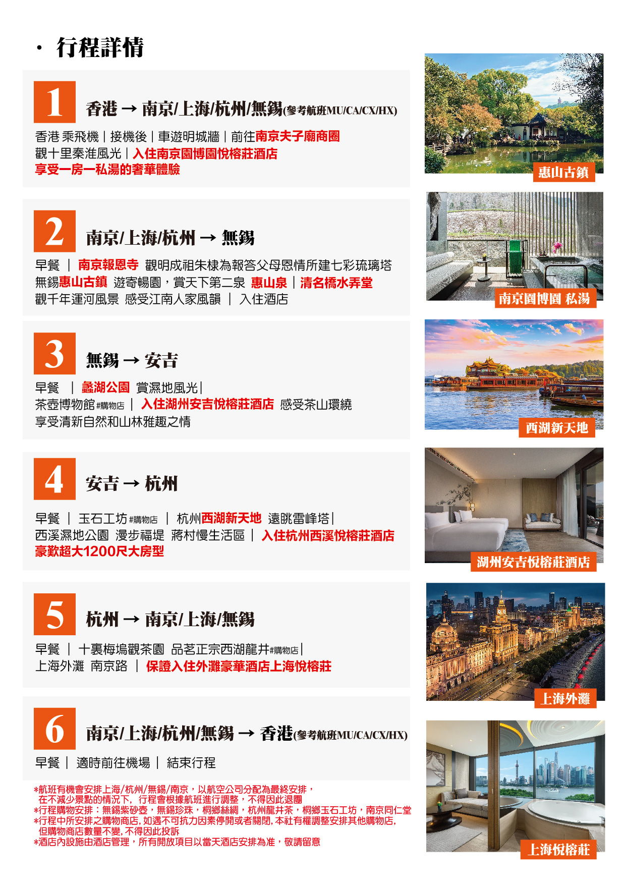 住宿:超班住宿安排 【杭州西溪濕地悅榕莊】豪歎超大1200尺套房、【南京園博園悅榕莊】獨享一房一私湯、【上海外灘悅榕莊】頂層安排飲品1杯 打卡絕美陸家嘴和外灘風光、湖州安吉悅榕莊酒店 暢遊:【無錫惠山古鎮】、江南名園【寄暢園】、惠山泉、杭州西湖新天地、南京報恩寺、上海外灘 品嚐:金陵風味餐、杭幫菜、紫清湖風味餐