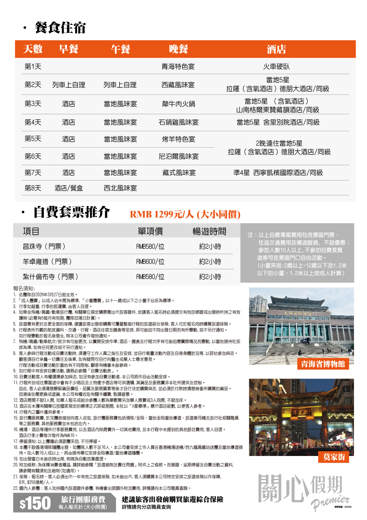 品嘗:犛牛肉火鍋 石鍋雞風味餐 烤羊特色宴; 住宿:5晚入住西藏當地五星標准酒店 暢遊:西藏世界上最宏偉的宮殿 世界屋脊【布達拉宮】;拍攝布達拉宮夜景,品【布達拉宮咖啡】 50元人民幣背面圖案拍攝地【藥王山觀景臺】 藏民轉經的最佳地點【大昭寺廣場】 【八廓街】 山南:藏文化發源地【雍布拉康】(包門票)西藏第一座宮殿 觀賞非遺名錄之一【雪巴藏戲】(包門票)了解地道藏族文化